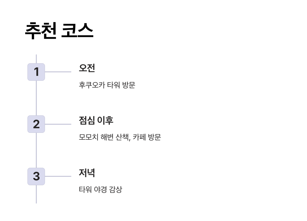 이번 글에서는 두 명소를 하루 안에 효율적으로 즐길 수 있는 방법을 안내합니다. 타워의 멋진 풍경, 모모치 해변의 즐길 거리와 맛집 추천까지, 특별한 후쿠오카 여행을 계획하시기 바랍니다.