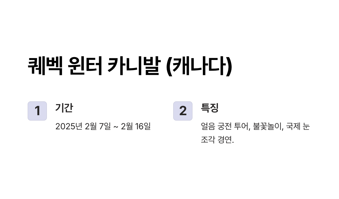 - 소개: 캐나다 퀘벡 윈터 카니발의 프로그램, 티켓 예매, 얼음 궁전 투어 정보 등을 제공하며, 불꽃놀이와 퍼레이드 일정도 확인 가능합니다.