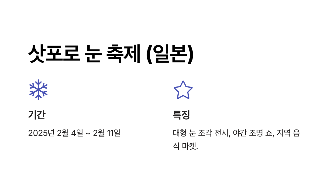 - 예: 화천 산천어 축제와 춘천 남이섬 방문, 삿포로 눈 축제와 오타루 운하 투어 등.
