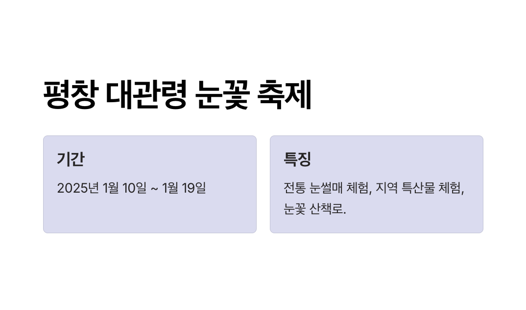 - 축제 기간 동안 대관령 양떼목장을 함께 방문해 설경을 즐기는 것을 추천.