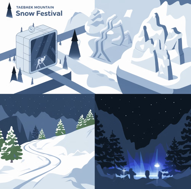 - 태백산 설경 트레킹: 장군봉과 천제단 코스를 따라 설경을 감상하며 태백산의 웅장함을 체험. 트레킹 코스에는 다양한 포토존 마련.