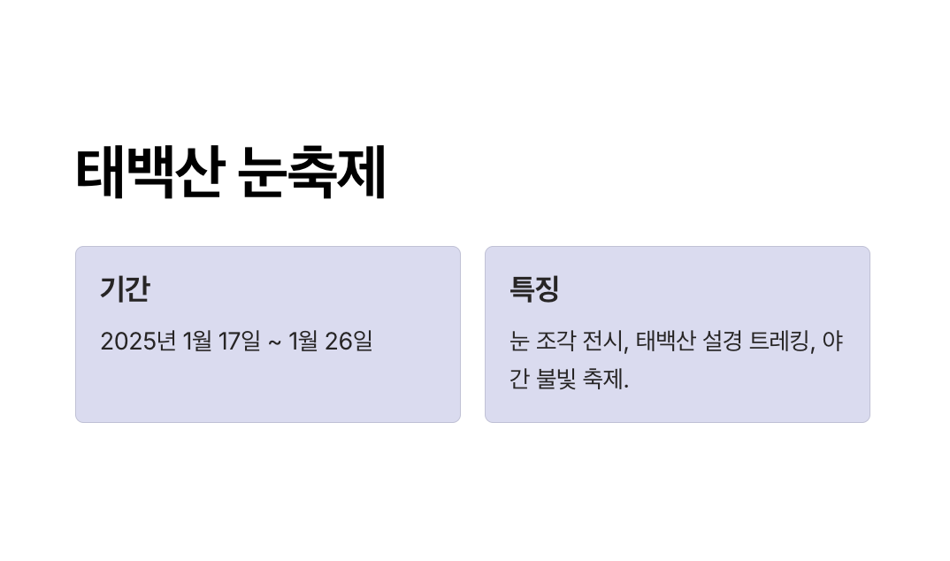 - 소개: 태백산 눈축제의 일정, 주요 프로그램, 트레킹 코스 정보 등을 제공하는 공식 페이지입니다. 축제 전 트레킹 준비물과 날씨 정보를 확인하세요.