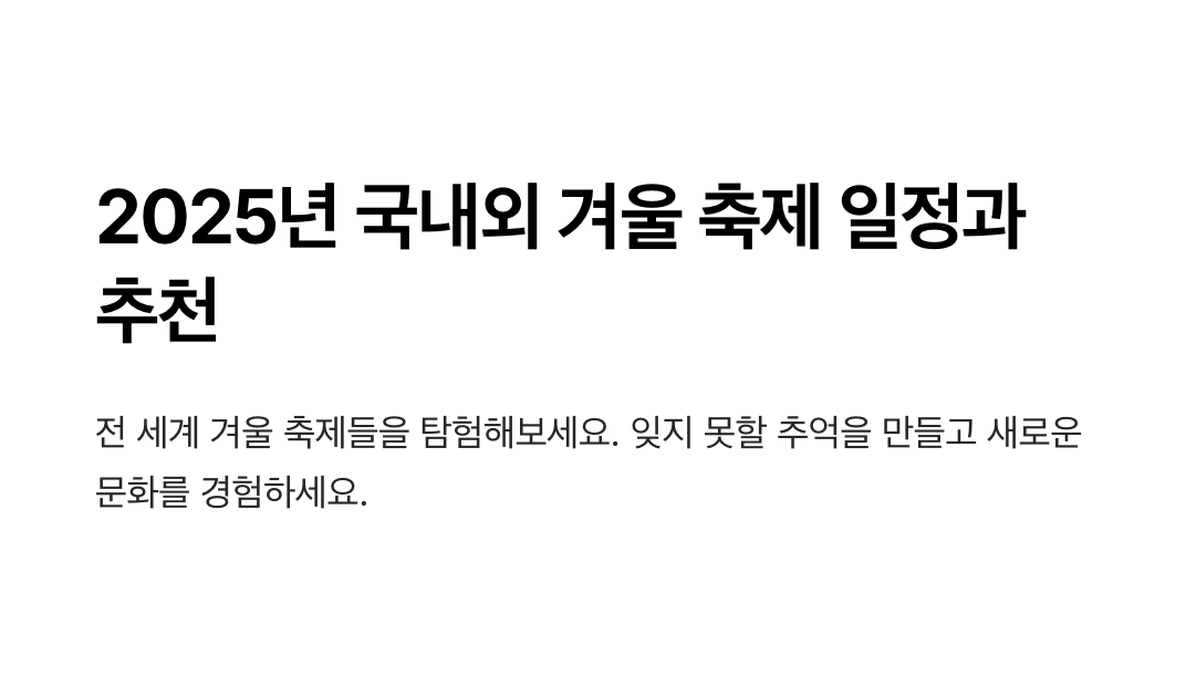 겨울 축제는 단순한 행사를 넘어, 가족, 연인, 친구와 함께 특별한 추억을 만들 수 있는 소중한 시간입니다. 이번에 소개된 국내외 겨울 축제 TOP 10은 각기 다른 매력을 지니고 있어 취향에 맞는 축제를 선택할 수 있습니다.