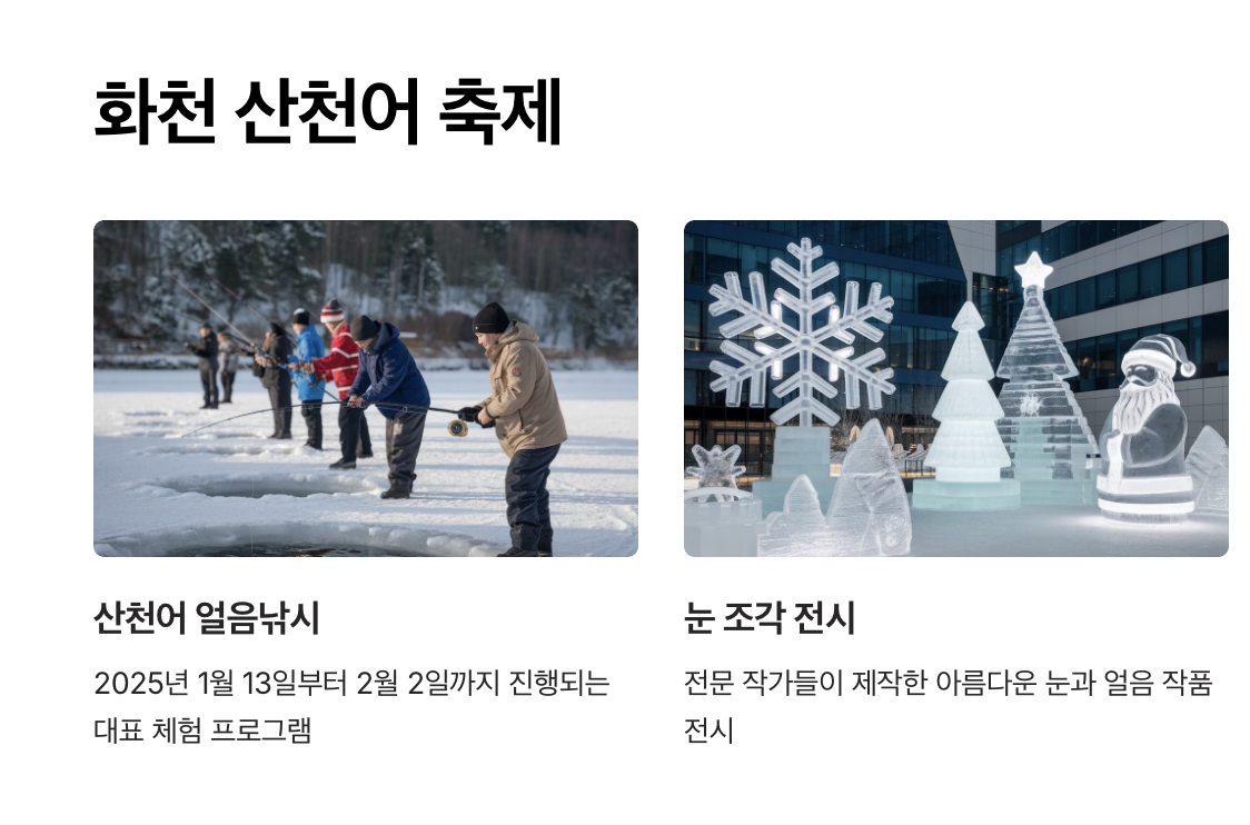 - A2. 가족 단위로 즐기기 좋은 축제는 화천 산천어 축제와 태백산 눈축제입니다. 얼음 낚시, 눈썰매, 눈 조각 전시 등 아이들도 즐길 수 있는 다양한 프로그램이 마련되어 있습니다.