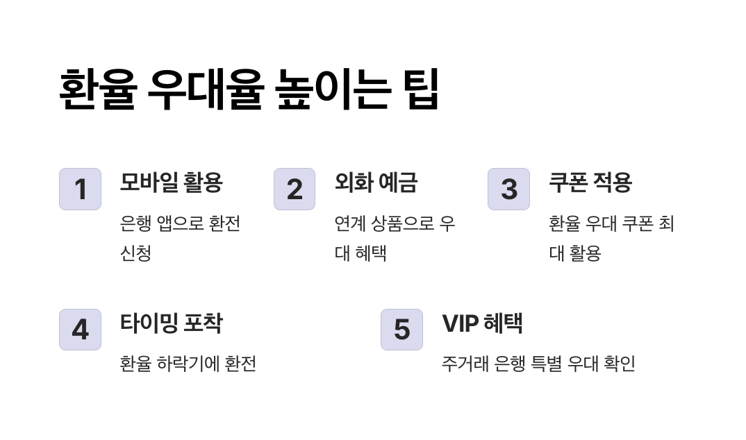 - 환전 수수료 절감: 우대율이 높을수록 환전 시 부담하는 비용이 줄어듭니다.