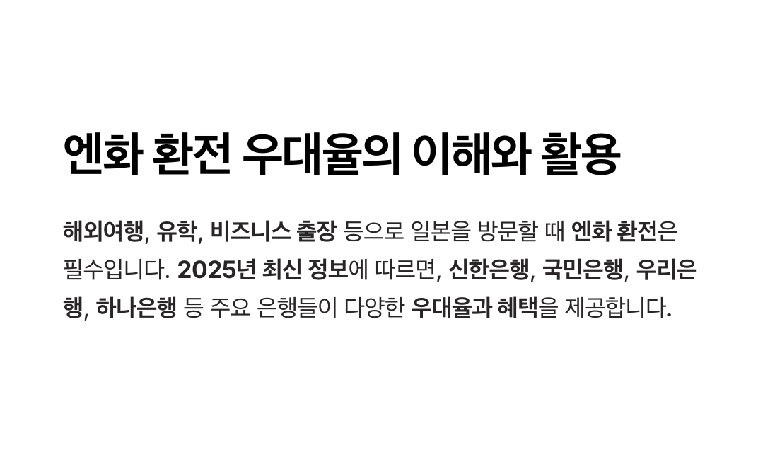 엔화 환전 우대율은 환전 비용 절감에 큰 영향을 미치므로, 각 은행의 우대율과 혜택을 꼼꼼히 비교하는 것이 중요합니다. 2025년 최신 정보 기준으로, 하나은행은 최대 90% 우대율을 제공하며, 신한은행과 우리은행도 각각 90%, 85% 우대가 가능합니다.