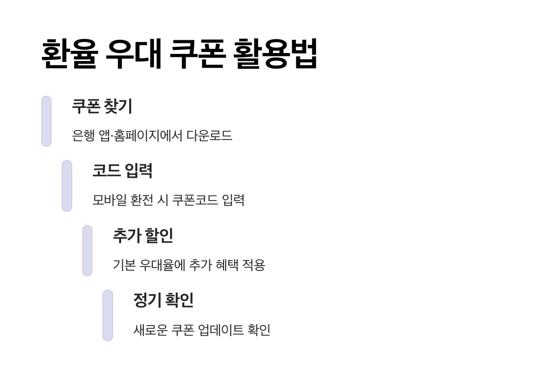 - 환전 우대 쿠폰을 사용하면 기존 우대율에 더해 추가 할인 혜택을 받을 수 있습니다.