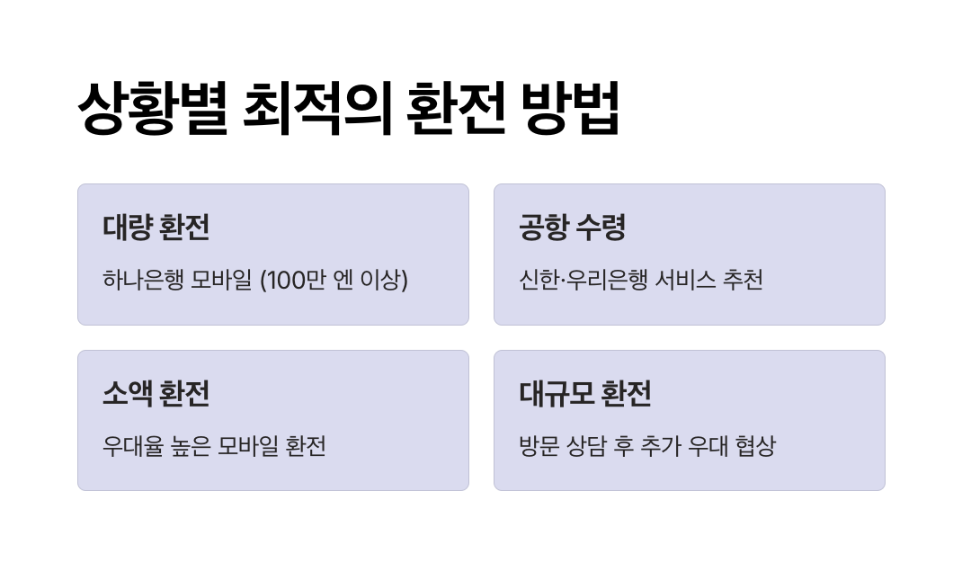 - 소액 환전 (50만 엔 이하) → 신한은행, 우리은행 모바일 환전 추천