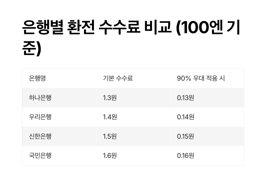 | 은행명 | 기본 환전 수수료 (1엔당) | 90% 우대 적용 후 환전 비용 |
