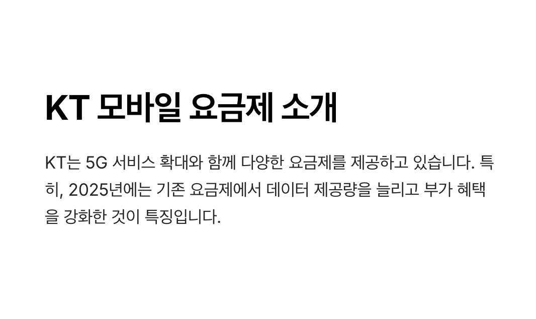 | 1. KT 공식 홈페이지 – 요금제 안내 | KT의 5G, LTE, 인터넷, 알뜰폰 요금제 정보를 확인할 수 있는 공식 사이트입니다. 요금제 세부 사항, 부가 혜택, 가입 방법 등을 안내합니다. |