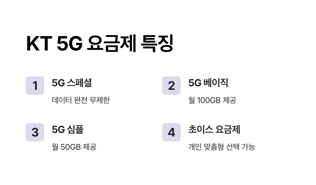 KT는 5G 서비스 확대와 함께 다양한 요금제를 제공하고 있습니다. 특히, 2025년에는 기존 요금제에서 데이터 제공량을 늘리고 부가 혜택을 강화한 것이 특징입니다.