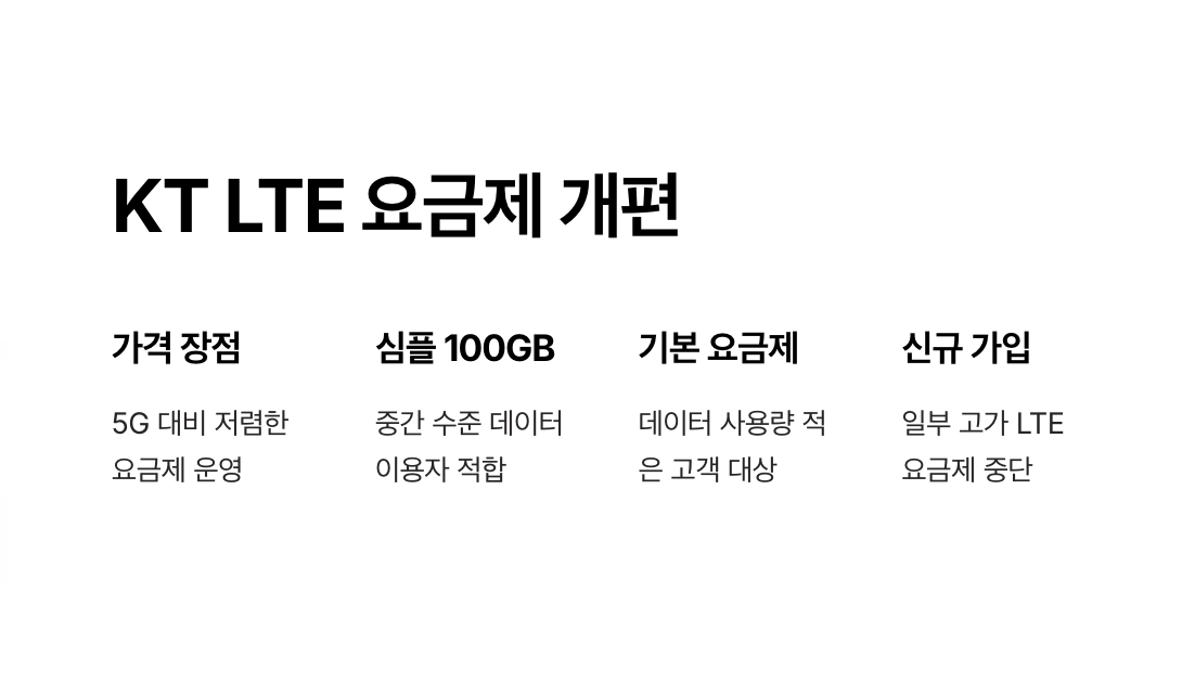2025년 기준, KT는 LTE 요금제를 일부 개편하였으며, 5G 요금제보다 비싸거나 데이터 제공량이 적은 LTE 요금제는 신규 가입이 제한되었습니다.