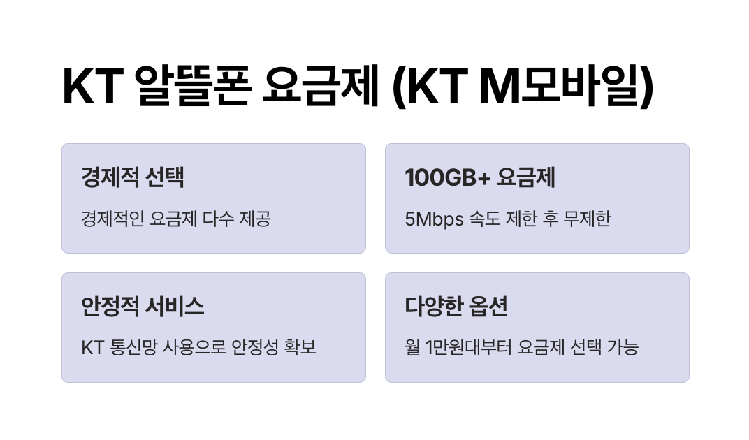 KT의 자회사인 KT M모바일은 합리적인 가격대의 알뜰폰 요금제를 제공하며, 기존 KT망을 활용하기 때문에 통화 품질과 속도 면에서 차이가 없습니다.