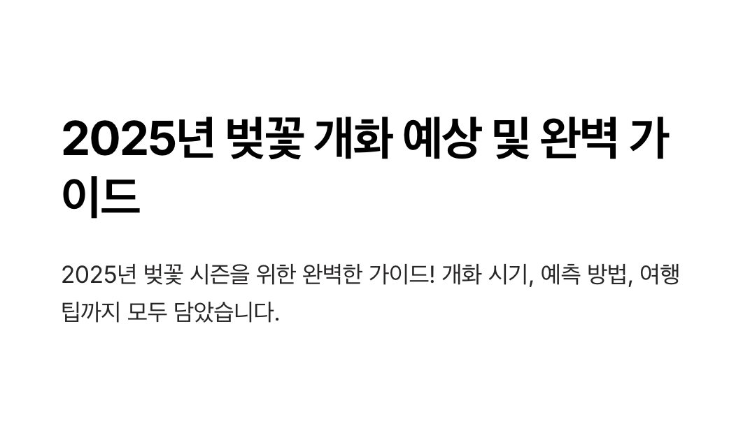 - A1. 벚꽃 개화는 매년 평균 기온과 강수량에 영향을 받습니다. 2025년은 기온이 평년보다 높을 경우 개화가 앞당겨질 가능성이 있으며, 반대로 이상 저온이 지속되면 개화가 지연될 수 있습니다.