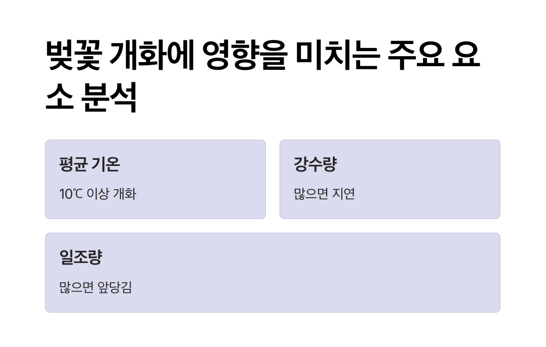 ✅ 기온이 높을수록 개화 시기가 앞당겨지고, 이상 저온이 지속되면 개화가 지연됩니다.