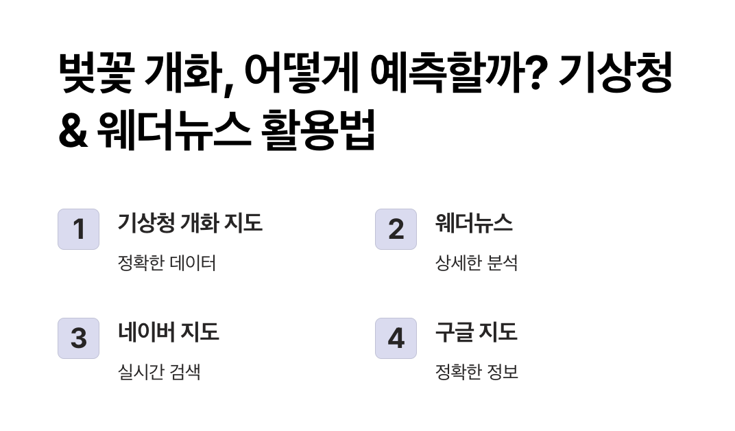 | 1. 기상청 벚꽃 개화 예보 | 기상청에서 제공하는 공식 벚꽃 개화 예측 서비스입니다. 매년 3월부터 5월까지 벚꽃 개화 현황과 지역별 개화 예상일을 확인할 수 있습니다. |