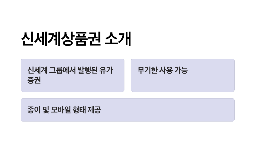| 신세계상품권 안내 페이지 | 신세계상품권의 구매 방법, 유효기간, 환불 기준, 사용처 검색 기능을 확인할 수 있는 공식 안내 페이지입니다. |
