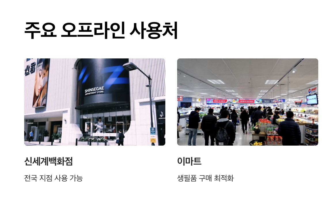| 가계 소비 전략 | 이마트 생필품 구매, 스타벅스 커피 등 생활 소비 항목에 활용 |