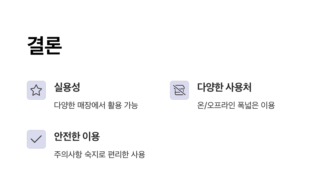 | 편의점 | GS25, CU 등 | 편의점은 사용 불가, 단 일부 스타필드 내 제휴 편의점 예외 존재 |