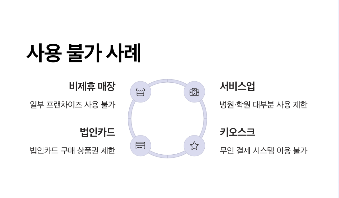 - 키오스크 자동결제: 일부 키오스크 기반 매장은 상품권 결제 기능이 비활성화되어 있음