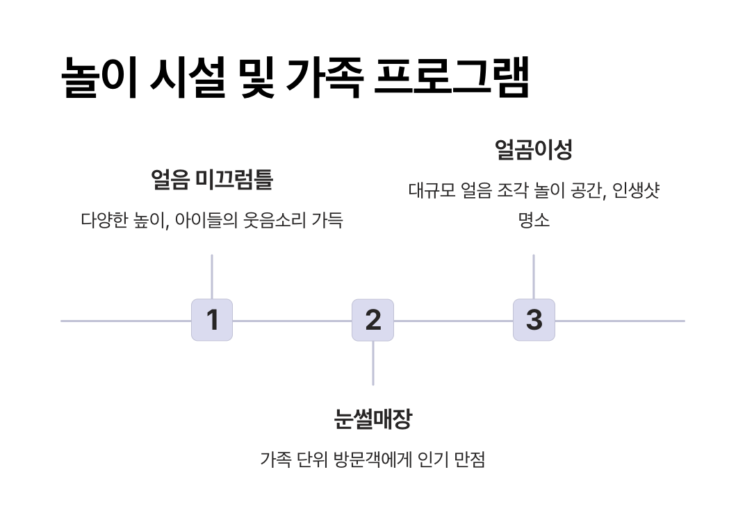 - 아이들과 방문하는 경우 안전을 위해 얼음 미끄럼틀과 눈썰매장을 먼저 방문하세요.