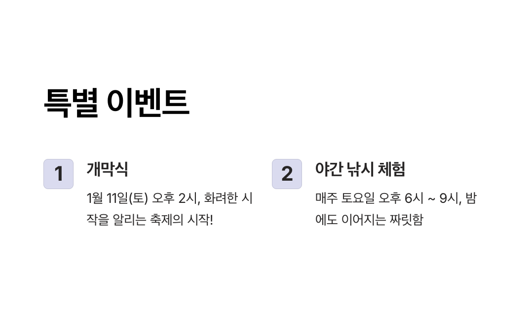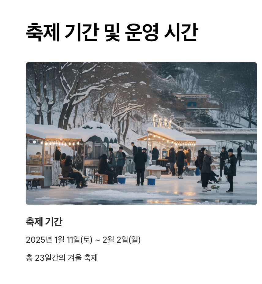 - 다양한 로컬 푸드 트럭이 운영되며, 핫초코, 떡볶이, 어묵 등 겨울철 인기 간식도 판매됩니다.