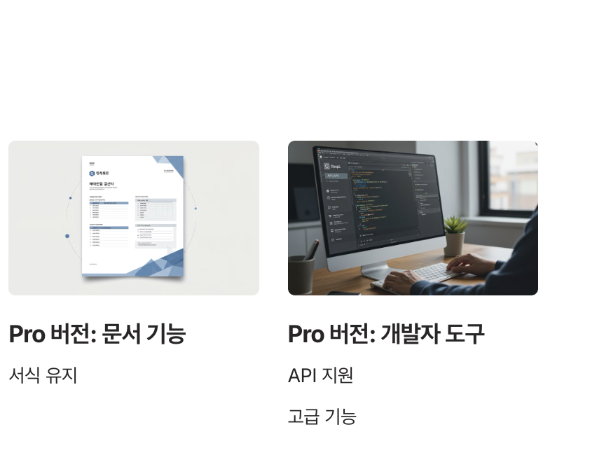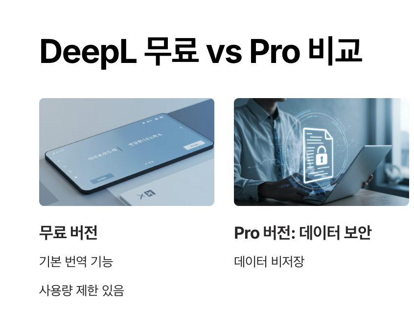 | 4. DeepL Pro 요금제 및 기능 비교 | DeepL 무료 버전과 Pro 버전의 차이를 비교할 수 있는 페이지입니다. Pro 버전은 데이터 보안 강화, 원본 서식 유지, 대용량 문서 번역 기능 등을 제공합니다. |