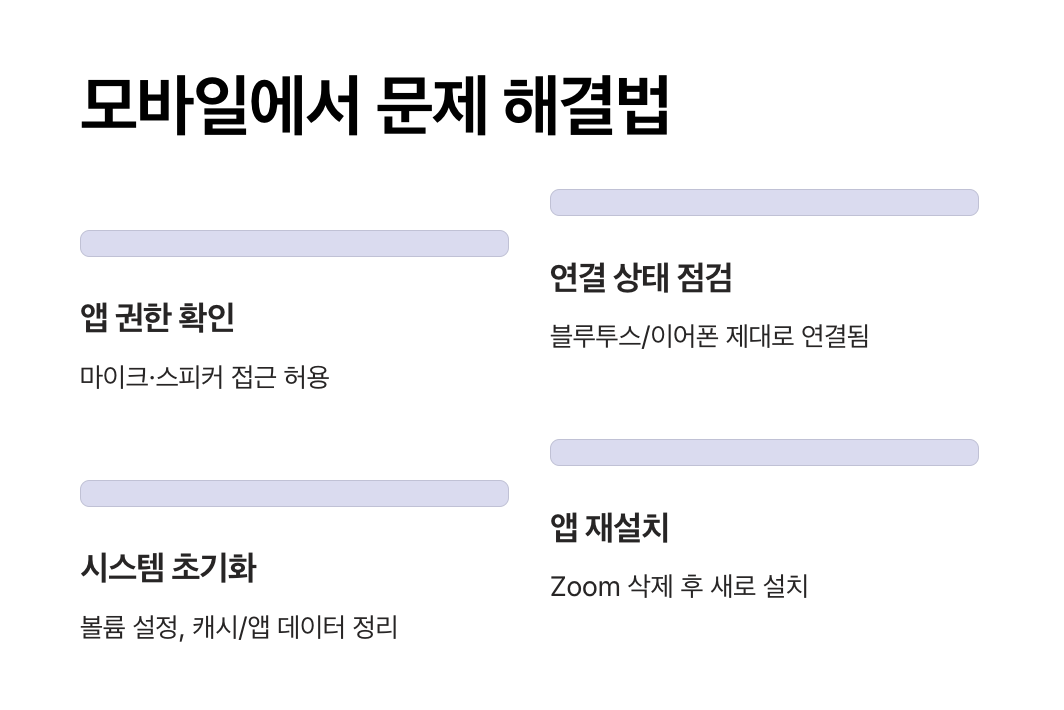 위 단계를 차례대로 확인 및 적용하면, 모바일 환경(안드로이드·iOS)에서 발생하는 Zoom 오디오 안 들림 문제를 효과적으로 해결할 수 있습니다.