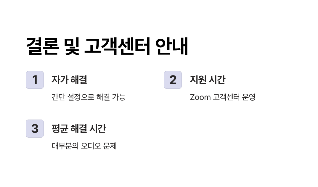 위 방법을 모두 시도했음에도 소리가 들리지 않는다면, Zoom 고객센터(앱 1:1 문의 또는 콜센터)를 통해 추가 지원을 받으시기 바랍니다.