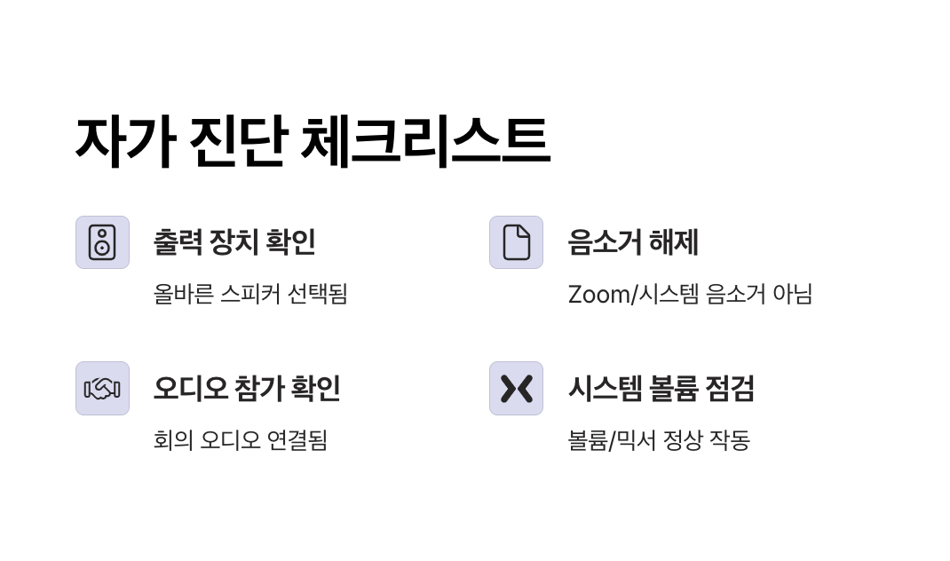 - 자가 진단 체크리스트(스피커 출력, 음소거 해제, 회의실 오디오 참가, 시스템 볼륨) 항목을 차례대로 점검해 보세요.